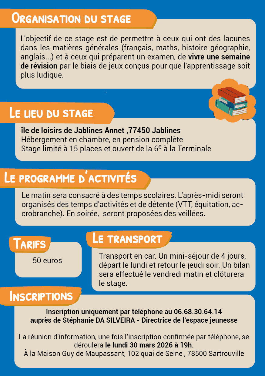 L’Espace Jeunesse de Sartrouville Animation lance les inscriptions pour son mini stage de révisions, destiné aux jeunes de la 6e à la Terminale.